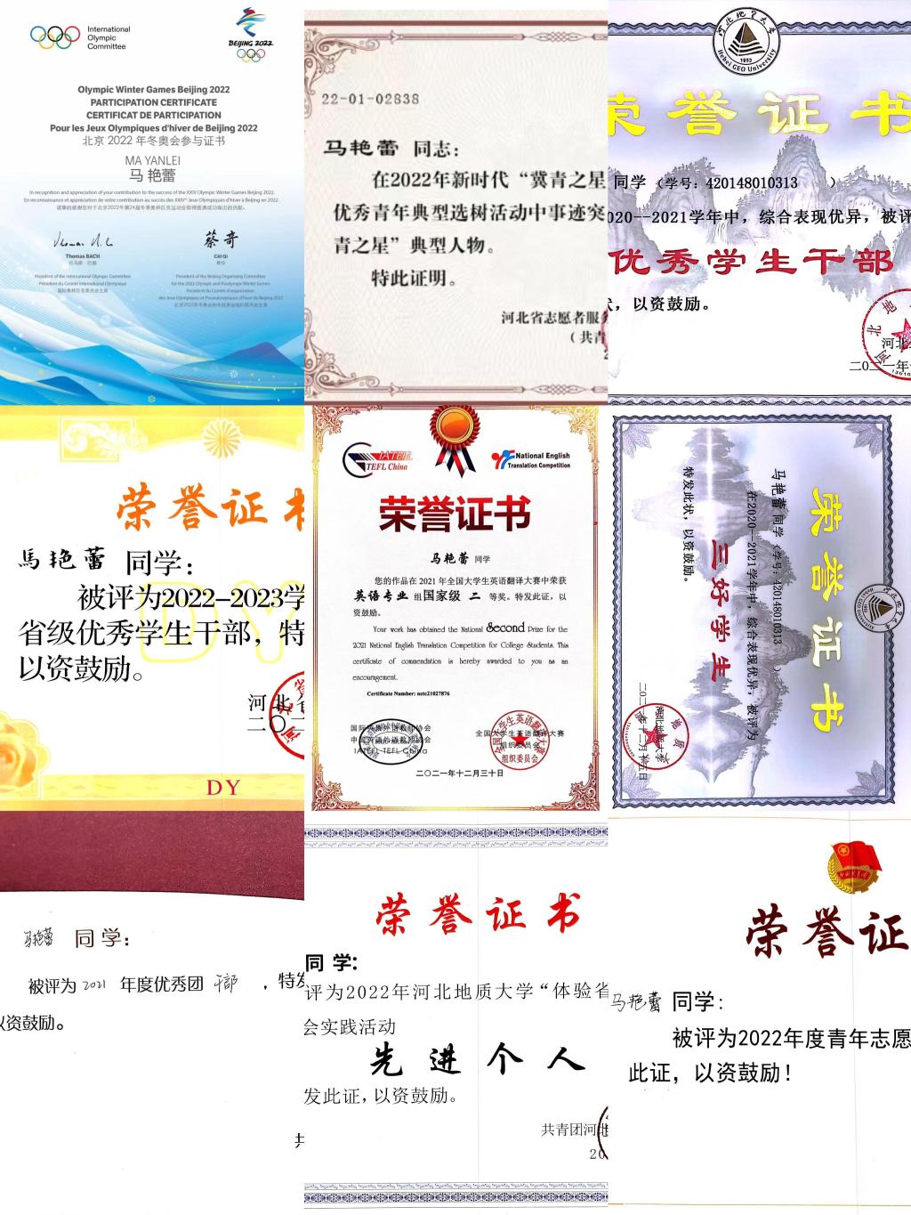 曾获2021年全国大学生英语翻译大赛国家级二等奖;2021年度校级优秀团干部;2022年北京冬奥会best365足球官网优秀志愿者;2022年新时代“冀青之星·青春冬奥会特别奖”优秀青年典型;2022年暑期社会实践活动获best365足球官网社会实践先进个人;2023年河北省优秀学生干部。