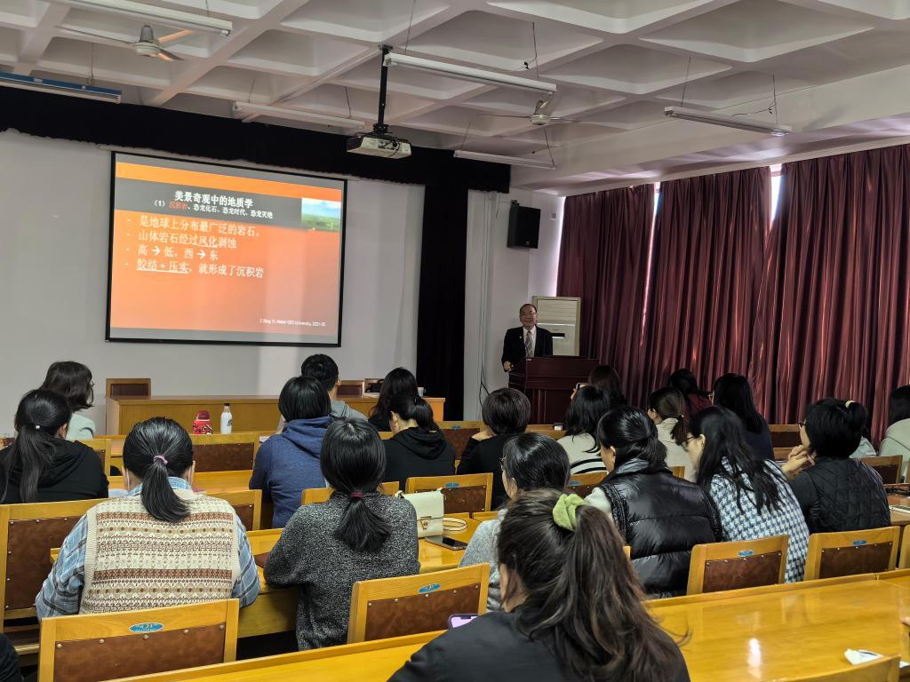 丁毅教授一直认为科普工作意义非凡,因为它能够让更多的人了解科学知识,激发他们对科学的兴趣。作为地质行业院校,地质学科是学校的特色和优势学科,为新生做好地学知识导论成为best365“仰山慕水”新生培育计划的重要内容之一。丁毅教授来校工作后,为本科生、研究生作了多次科普讲座,学生们都喜欢听他的“地质科学的奥秘”科普讲座,一名地学专业新生在听了他的讲座后深有感触地说道:“丁老师的讲座为我们学习地学专业打开了一扇门,让我们看到了地学世界的浩瀚知识海洋,让我们对地学知识和奥秘产生了浓厚的探索欲望。”丁毅不仅利用课堂讲授地学科学知识,他还经常走进学生之中,与同学们面对面交流,在教室外、在校园里、在餐厅,经常会看到他,他像一位和蔼可亲的长辈,用他渊博的知识,亲和的态度,幽默的表达,吸引一群群学生为他而坐,静静聆听。
