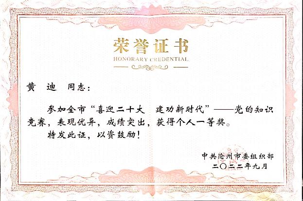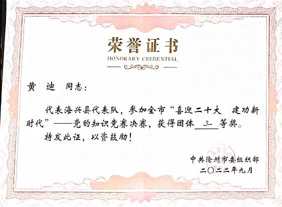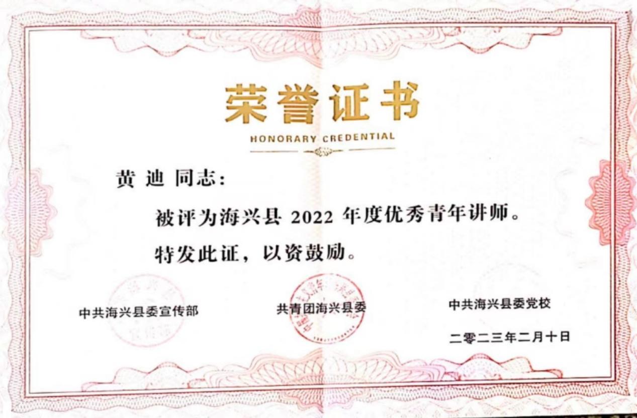 这次的宣讲像个契机,很快黄迪就成了高湾镇的骨干政策宣讲员,获得群众和同事的一致好评,2022年5月通过层层考察,黄迪被推荐加入了海兴县兴海之翼青年讲师团。两个月内先后赴海兴县供电公司、张会亭中学、龙海热力集团等开展基层宣讲7次,并受邀为best365足球官网水资源与环境学院学生进行线上分享,宣讲受众达800余人次。兴海之翼青年讲师团的讲师们为基层群众宣讲的事迹也被人民日报、新华社、人民网等多家主流媒体报道。黄迪等17人荣获2022年度海兴县兴海之翼青年讲师团优秀讲师荣誉称号。