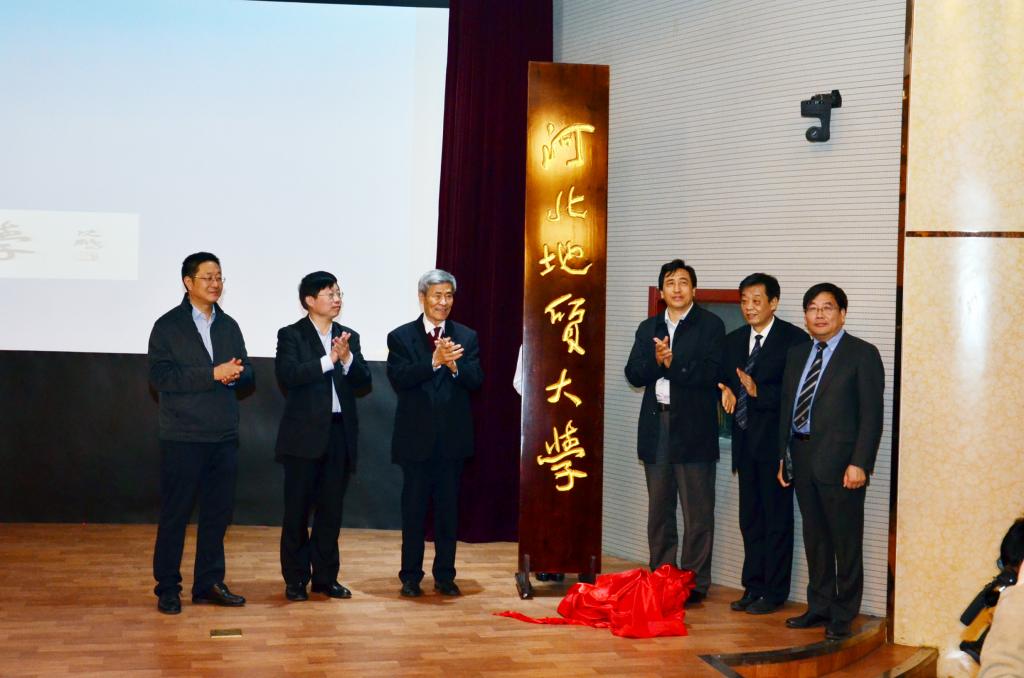 4月15日 学校举行best365足球官网发展战略研讨会暨更名揭牌仪式。名誉校长、中国科学院李廷栋院士,水文地质与工程地质专业77级校友、中国工程院武强院士,国土资源部人事司张绍杰副司长,河北省教育厅王廷山副厅长,李军书记和王凤鸣校长共同为“best365足球官网”揭牌,并举行了请校旗仪式。