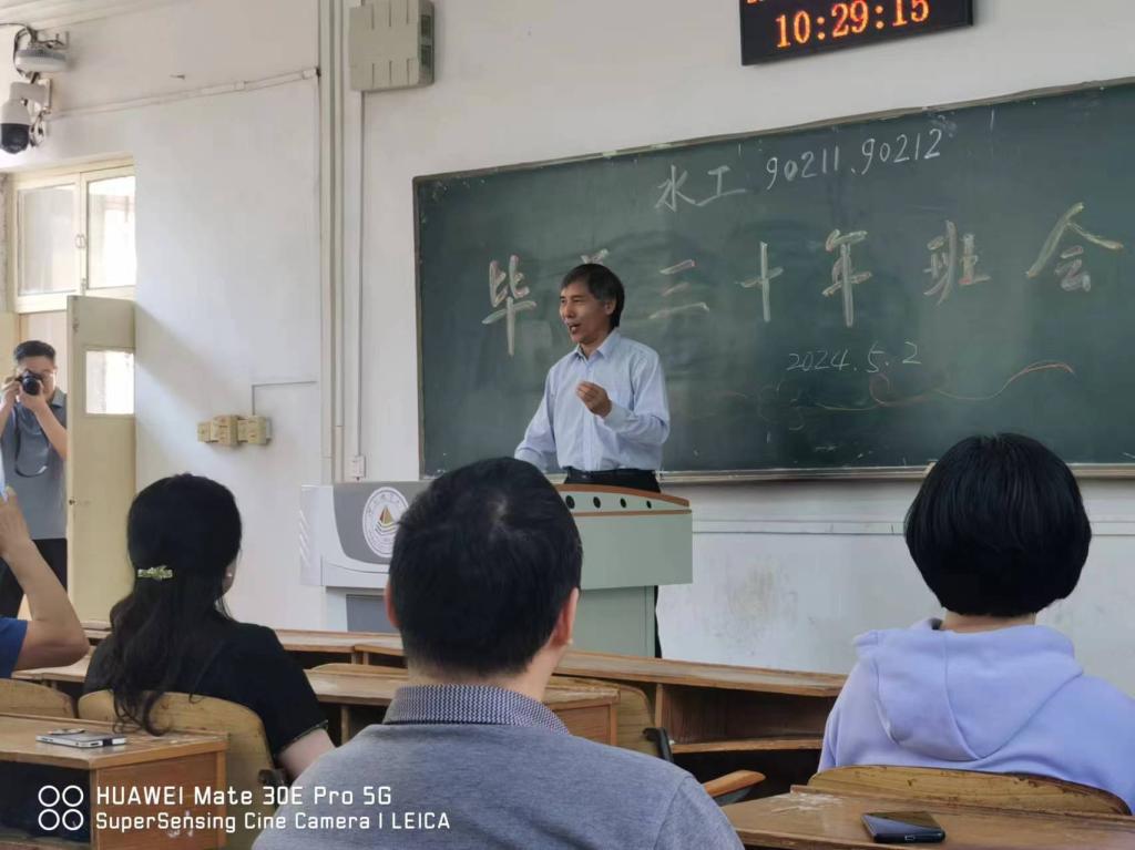 上午十点十分,随着上课铃声的响起,水工90211、90212班参加本次聚会的30多名学生准时到教二楼111阶梯教室召开“毕业三十年班会”。