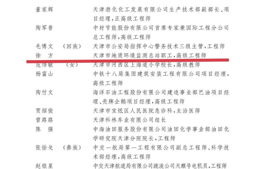 2006年工作至今,徐方承担项目获天津市国土资源和房屋管理局“科学技术一等奖”1次;获天津市地质矿产勘查开发局“科技进步二等奖”3次;天津市重点地区环境地质调查项目获“2017年天津市十大示范工程”称号。