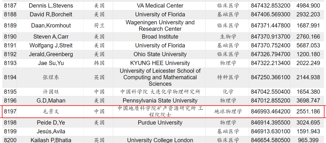 本次毛景文院士入围全球排名前10000名科学家榜单反映出我国学者的研究成果获得了国际学术界的广泛认可,也突显出我国矿床学研究工作的国际影响力。