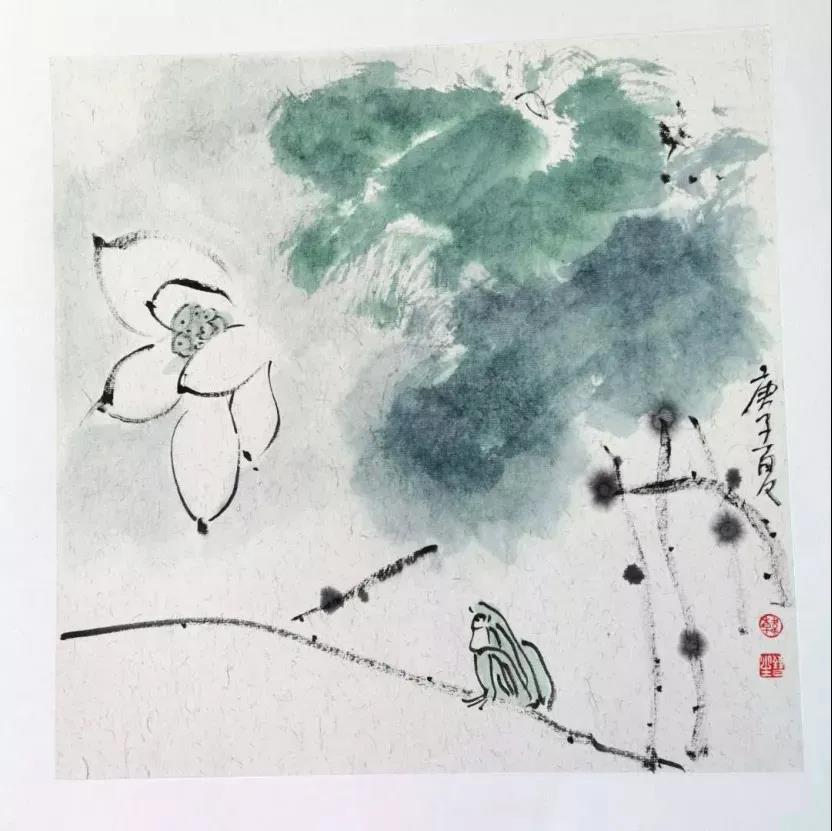 在中国传统的绘画语境中,莲的象征几乎人人皆知。而韩晋生先生并没有囿于成见,而是通过大胆构思,细心着墨,让一蛙、一荷,在一动一静之间,形成了微妙而紧张的况味。