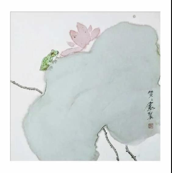 这一幅画,莲叶奇崛,形如不可攀的高山,莲花恍惚浮于其上,状如凌霄的危楼。而那一只圆睁双目的青蛙,紧紧抱住这陡峭的一叶,在那一抹淡粉的荷花之下,屏气凝神,仿佛是一次历经千辛之后的朝拜,抑或是一次心无旁骛的祈祷……